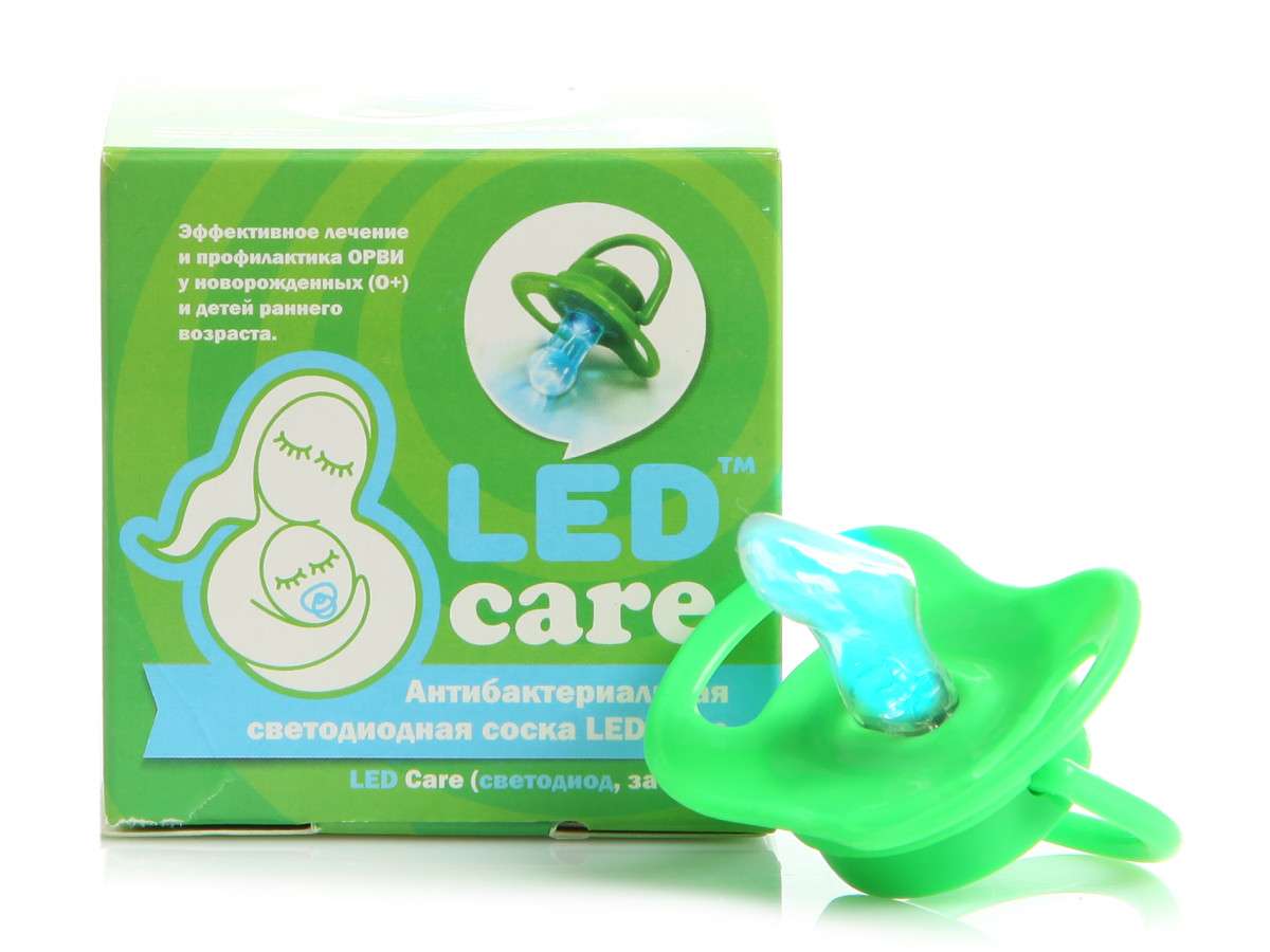 Антибактериальный прибор LEDcare работает по принципу фототерапии. Освещение гортани и полости рта светом синего диапазона спектра, обладающего эффективным антибактериальным действием. В процессе работы синего света появляются активные формы кислорода, способные повреждать целостность оболочки бактерии. Бактерия гибнет, не имея возможности далее размножаться. Фотодинамическая терапия не сталкивается с привыканием патогенных микроорганизмов к воздействию на них активных форм кислорода, генерируемых в процессе облучения, поэтому такая терапия становится действенным способом лечения. Прибор выполнен в виде соски со встроенным LED блоком.