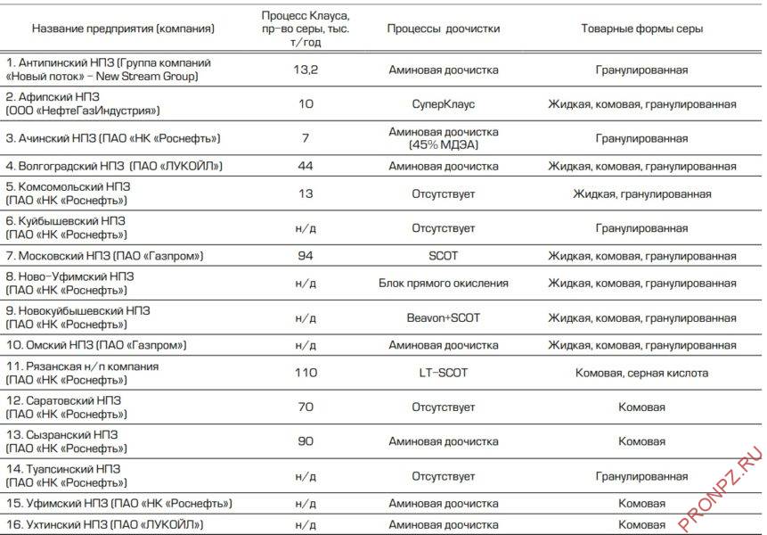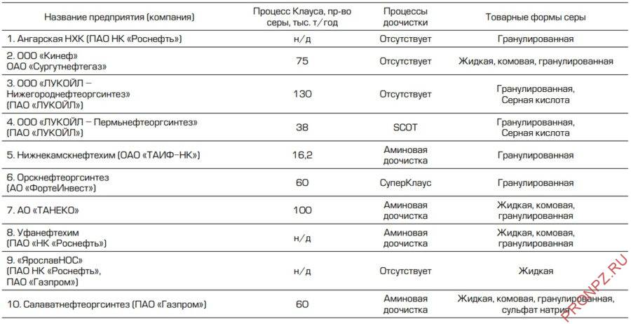 Таблица 1 – Нефтеперерабатывающие заводы России, производящие серу