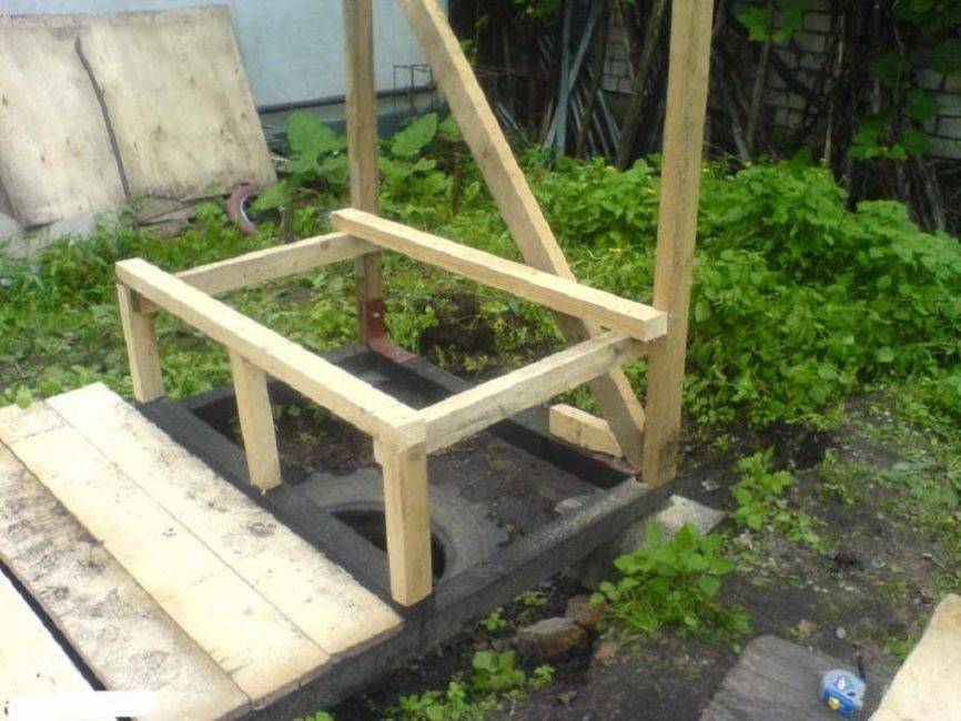 Далее переходят к возведению конструкционной части санузла – деревянного домика в виде шалаша. Рекомендуется следовать такой инструкции: