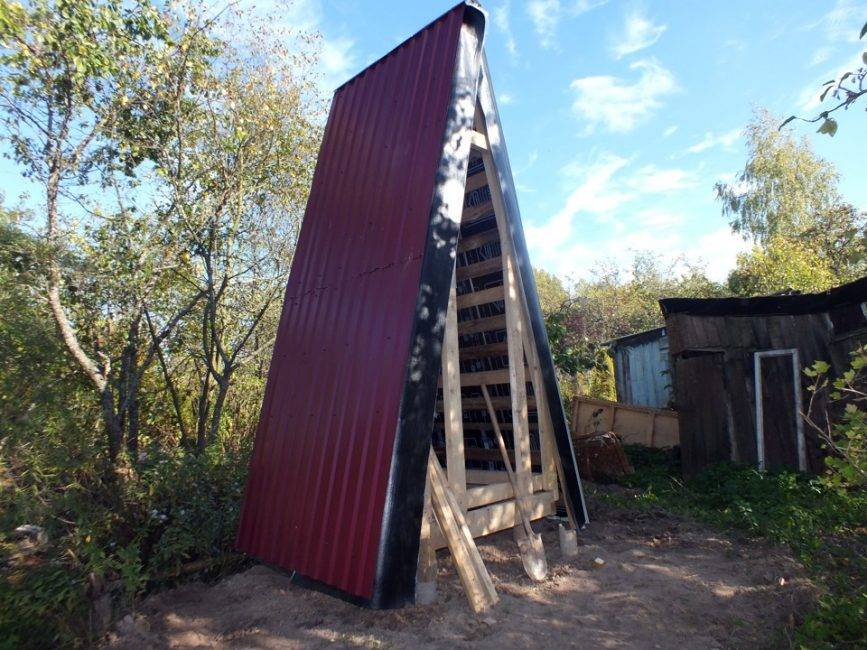 Далее ведётся монтаж крыши (она же служит боковыми стенками) из досок длиной 1,8–2 м, укладка кровельного материала и монтаж конька. Сверху предусматривают вентиляционное отверстие и трубу