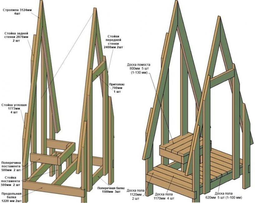 Из брусьев собирают фасадную и оборотную части конструкции по заранее подготовленным схемам. Готовые детали выглядят как равнобедренные треугольники с тремя перекладинами вдоль, расположенными на расстоянии. Изнутри обе заготовки отделываются полосками ДВП