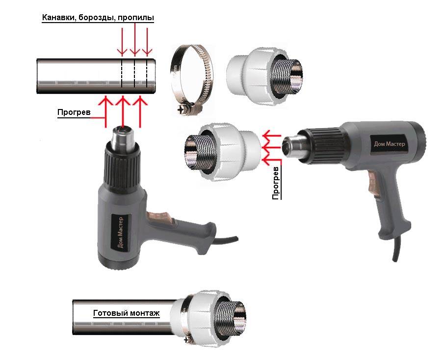 Максимально электрофеном прогреваем трубу и сразу переходим к прогреву внутренности посадочной муфты до характерного размягчения. Затем быстро садим до упора муфту на трубу. Надеваем зажимной хомут, и пока муфта не потеряла эластичности максимально, но без фанатизма обжимаем муфту, затягивая регулировочный винт.
