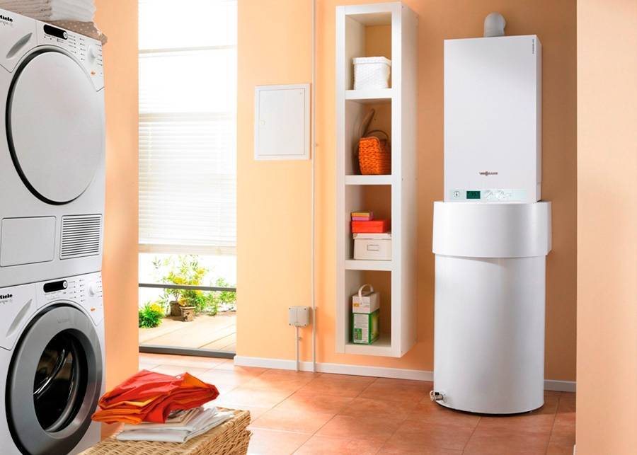 Устанавливают здесь как напольные, так и настенные котлы. Оборудование – насосы, смесители, распределители, коллекторы, обычно стараются закрепить над аппаратом и замаскировать шкафом. Кроме требования свободного доступа, никаких ограничений к установке не предъявляют.