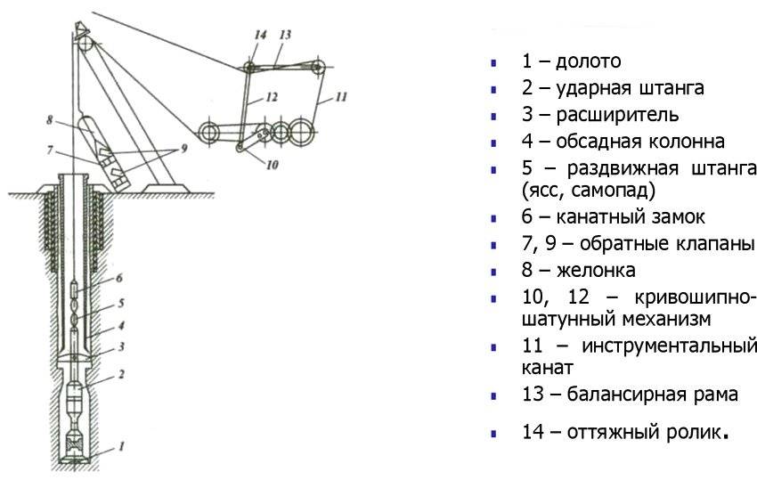Наиболее часто используемый способ. Данный метод предполагает разбивание грунта посредством опускания с двухметровой высоты тяжелого бурового инструмента. Конструкция, используемая при таком виде бурения, состоит из элементов: