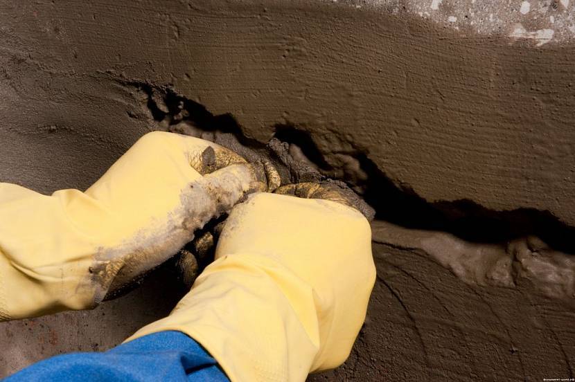 - Следующий этап: заделать трещины, сколы и стыки. Здесь можно использовать цементно-песчаную смесь с добавкой клея ПВА (5 к 1) или использовать готовые смеси.