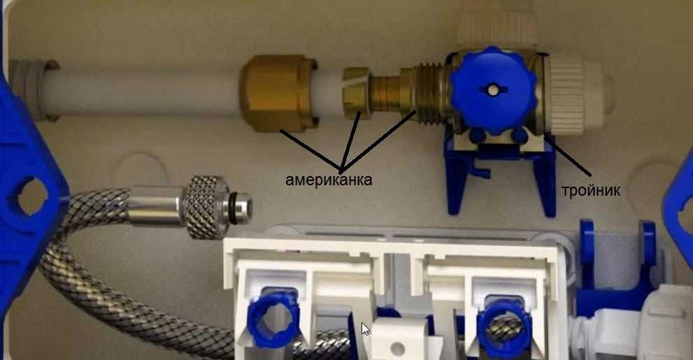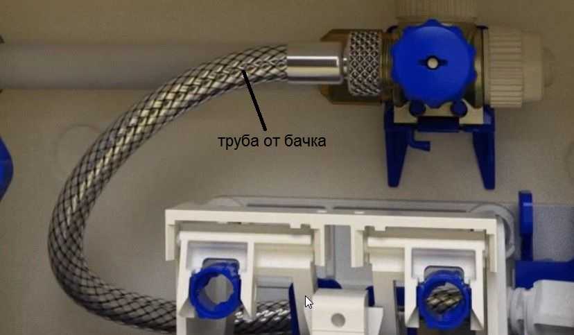 К специальному входу тройника подключается шланг от бачка. Он гибкий, в металлической оплетке. Затягивается накидной гайкой.
