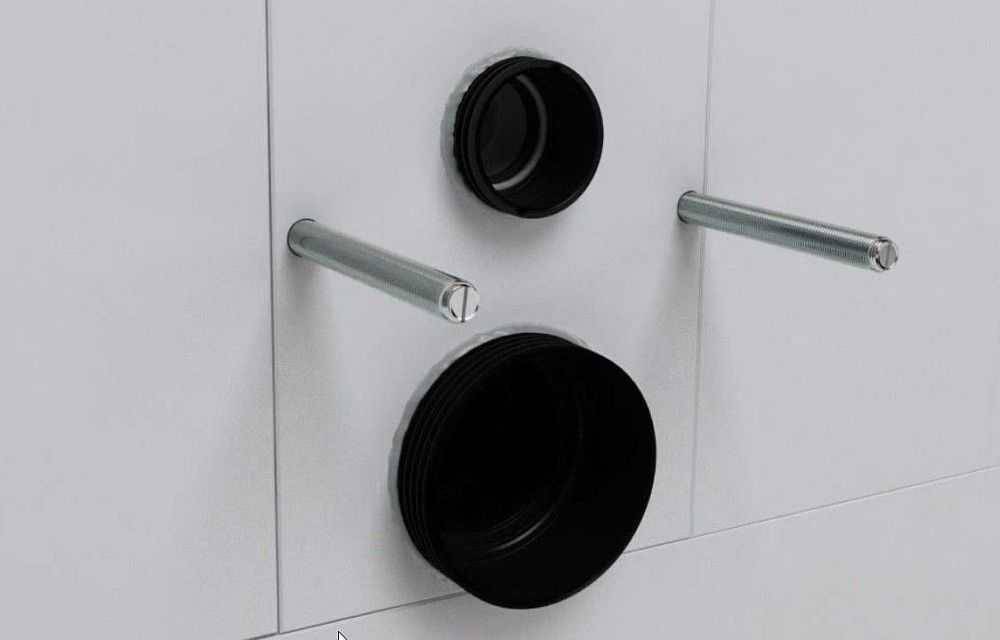 Выставленную раму надо зафиксировать к стене. В соответствующих местах ставят отметки карандашом или маркером, сверлят отверстия. В них устанавливаются пластиковые корпуса дюбелей. Большая часть подвесных унитазов импортного производства, а они рекомендуют корпуса дюбелей сажать на герметик. В просверленное отверстие выдавливается некоторая часть герметика, вставляется дюбель. Затем, перед установкой самого крепежа, герметик накладывается в пластиковый корпус.