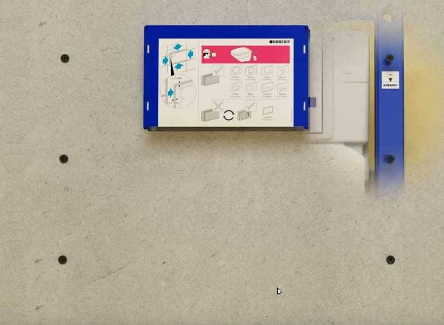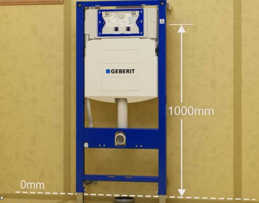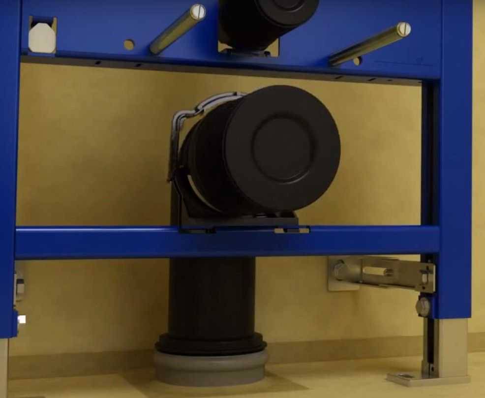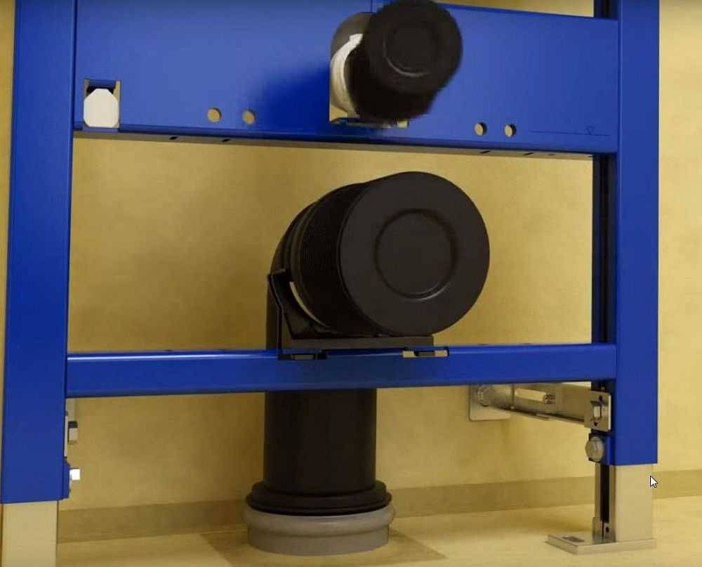 Собранная рама приставляется к стене, ее центр выставляется над серединой канализационного выхода. Метка на раме поднимается или опускается на требуемую производителем высоту (есть отметка на раме, также указана в паспорте, обычно это 1 метр).