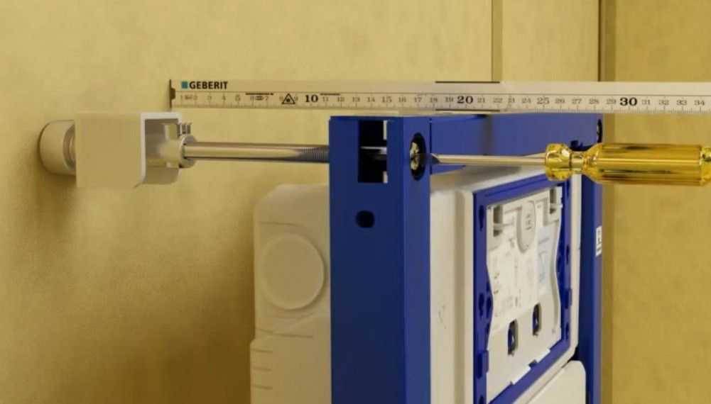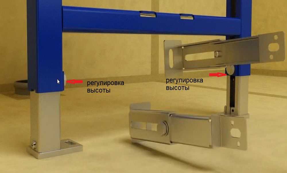 Установка подвесного унитаза начинается с крепления к раме инсталляции упоров в стену. Они крепятся по два верху и внизу. С их помощью регулируется расстояние до стены, поднимается и пускается рама.