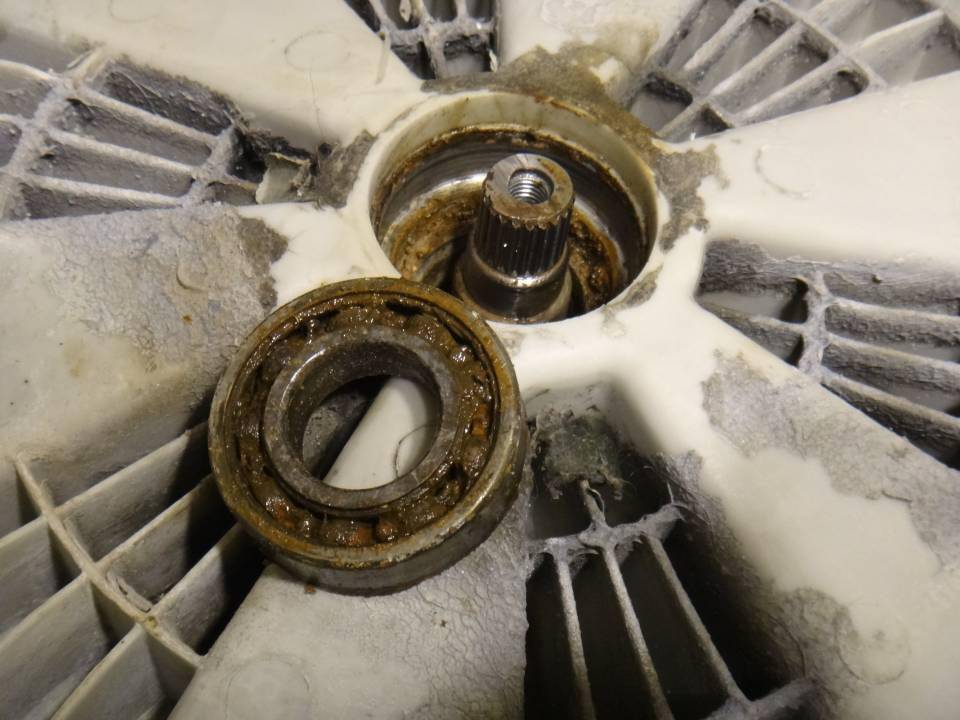 При расшатывании подшипника изнашивается сальник, через него подтекает вода опять же, на подшипник. Хоть он закрытого типа, однако вода щелочку находит, вымывает смазку, способствует коррозии. Эти процессы еще больше разрушают и так не новый узел. Вытекающая вода отличается бурыми разводами — следы ее видны с задней стороны машинки. Ржавчина может попасть на белье, отстирывается с трудом.