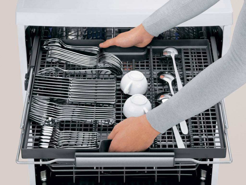Важно правильно загрузить посудомоечную машину, аккуратно распределив и закрепив всё, что легко бьётся, острое и маленькое − в верхней части, тарелки − в среднем лотке и большую посуду − в нижнем отделении