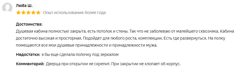 Покупатели отзываются о модели положительно, отмечается удобная конструкция двери, позволяющая содержать кабину в чистоте. Также хвалят плотное закрывание, исключающее сквозняки во время водных процедур. Отдельное достоинство – качество гидромассажных форсунок, создающих достаточный напор.