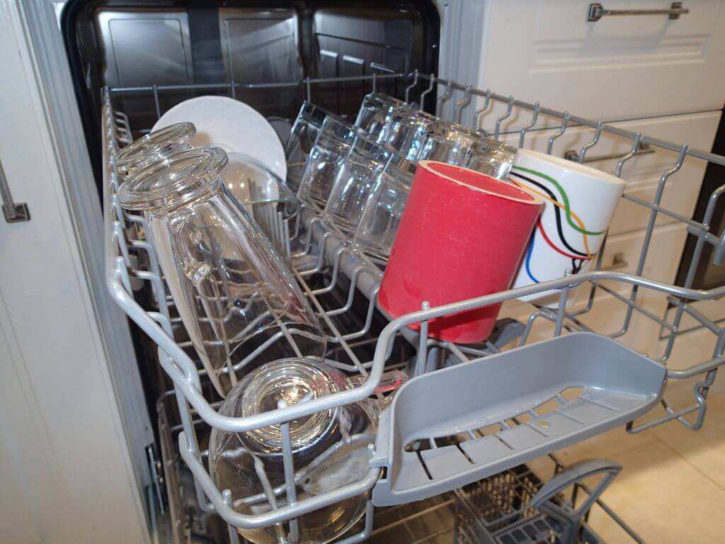 В большинстве случаев, стаканы, фужеры, бокалы, кружки и чашки располагают в верхней корзинке вверх дном. Такое положение дает возможность вымыть и ополоснуть внутреннюю поверхность, а жидкость при этом будет свободно стекать вниз (см. фото).