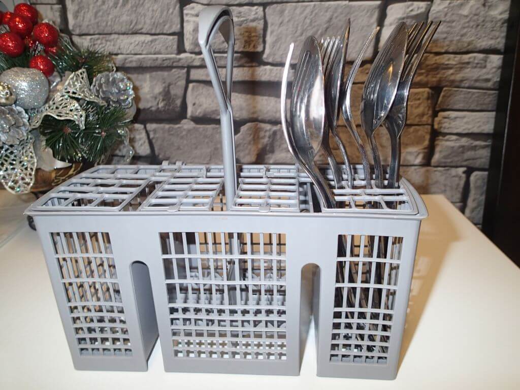 - Лоток или отдельная корзина для столовых приборов. Ложки, ножи и вилки аккуратно расставляют или раскладывают по отсекам, не допуская нагромождения.