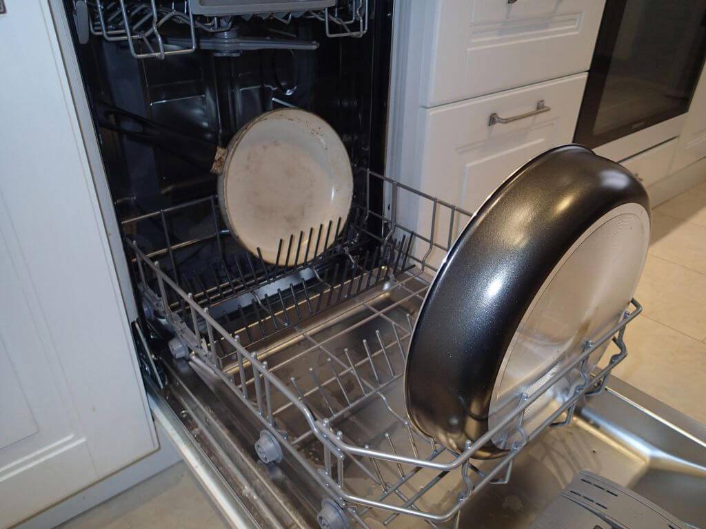 Противни лучше всего установить по краям лотка, чтобы они были поближе к стенкам камеры. В случае со сковородками нужно экспериментальным путем определить, как их лучше мыть – в строго вертикальном положении или под небольшим углом. Кастрюли лучше всего положить в нижнюю корзину днищем вверх. При этом в верхний лоток посуду не загружайте, и запускайте ПММ в режиме половинной загрузки.