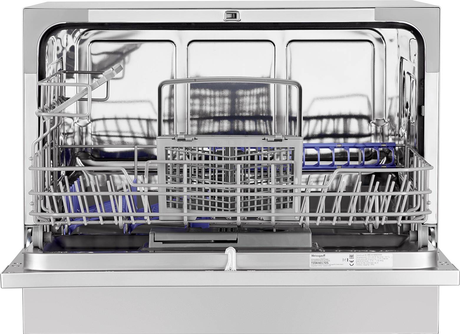 Настольная посудомойка — компактная машина габаритами с микроволновую печь. За цикл такая “малышка” в среднем очистит 5 комплектов посуды. Для семьи из трех человек или холостяка вполне достаточно.