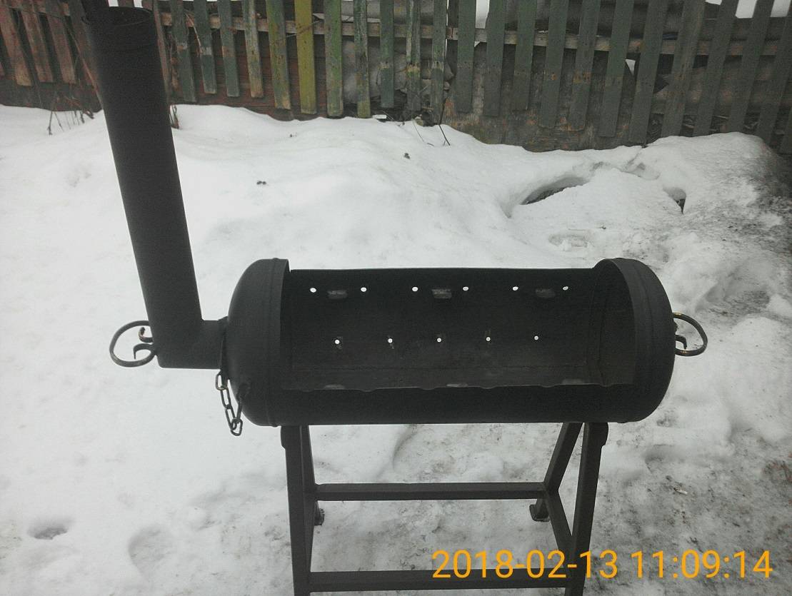 Для обеспечения лучшей тяги и чтобы дым не мешал находящимся рядом, можно к боковине мангала из баллона, трубы или бочки приделать дымоотводящую трубу. Работы это добавит, но не очень сильно. Зато пользоваться будет комфортнее: дым хорош на шашлыке, а дышать им совсем не хочется.
