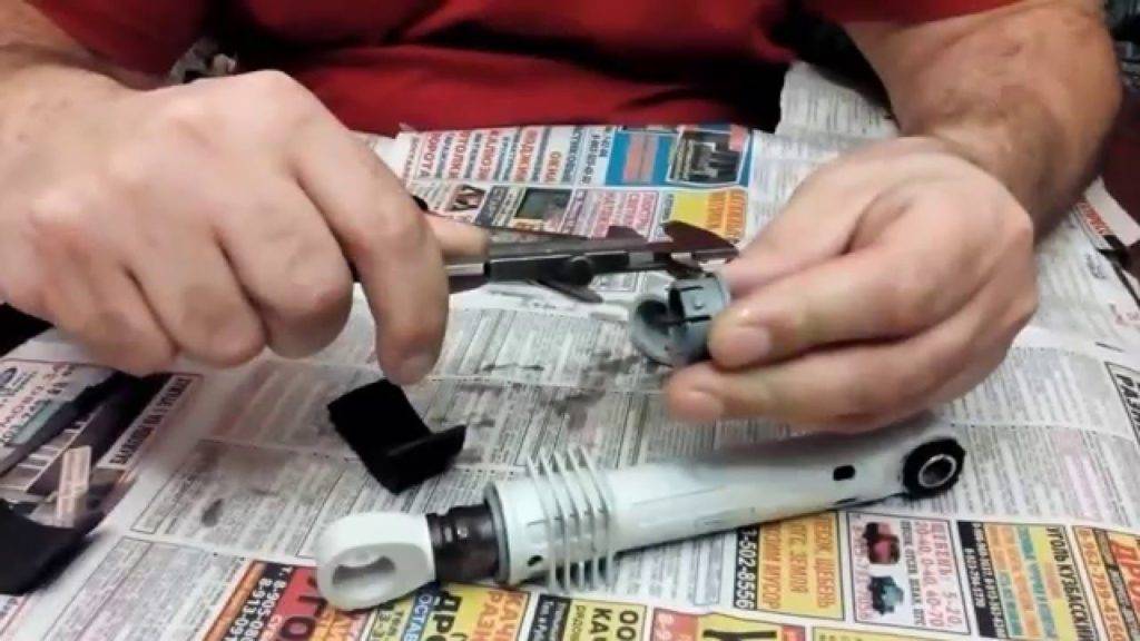 Как можно своими руками отремонтировать амортизатор в стиральной машине? Для начала вытащите вставку, которая тормозит движения штока. Если шток двигается легко и быстро, скорее всего, вставка (прокладка) износилась. Чтобы ее заменить: