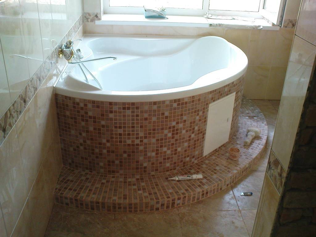 Для треугольной или угловой ванны удобнее всего делать пластиковое или гипсокартонное экранирование. Сложные формы идеально принимают лицевую отделку мозаикой, красиво подчеркивающей контур чаши. Монтаж криволинейных экранов также начинают с возведения каркаса и затем подгоняют обшивку по месту, в соответствии с плавными линиям и изгибами ванны.