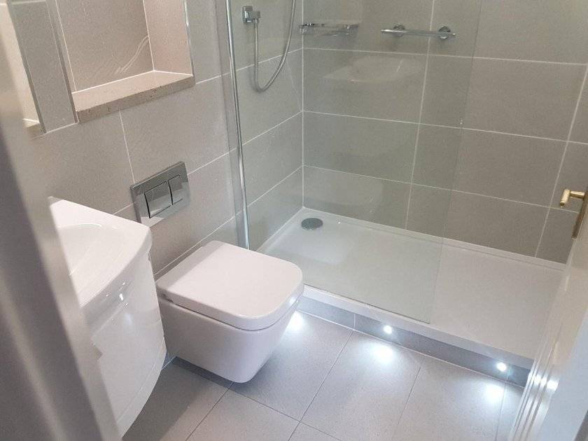 На фото короб из влагостойкого гипсокартона с коммуникационным люком и облицовкой керамогранитом.