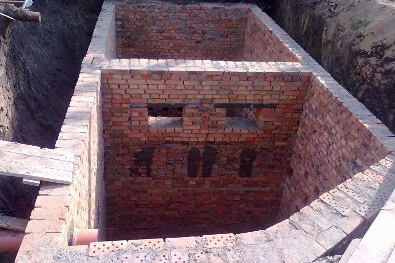 Сначала необходимо вырыть котлован. Он обкладывается кирпичом, плюс, поскольку необходима герметичность, выполняются работы по качественной гидроизоляции. Этот котлован разделяется на несколько камер (приемная, камера анаэробной очистки, выходная камера). На дно приемной и очистительной камер, заливается бетон, дно последней, засыпается песком, гравием или щебнем. Необходимо сделать отверстия для труб и предусмотреть качественную вентиляцию. Септик закрывается сверху бетонной плитой. Он отличается длительным сроком службы, достаточным объемом, с лихвой покрывающим нужды.