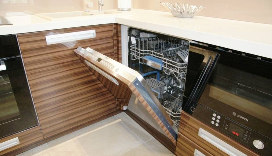 Узкие модели подходят для малогабаритных кухонь. Их дверца закрывается фасадом кухонного гарнитура, что минимизирует шум во время работы.