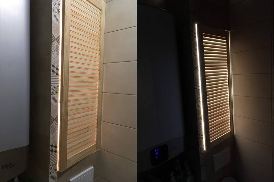 Жалюзийные двери отличаются несложной установкой, симпатичным внешним видом (даже с намеком на «изыски» вроде подсветки) и демократичной стоимостью. Но не обошлось и без минусов. Недостаток первый — готовые двери должна «попасть» в ваш размер. Недостаток второй — если спрятанные за ними трубы шумят, то «дырявая» структура будет приглушать звук не так сильно, как хотелось бы.