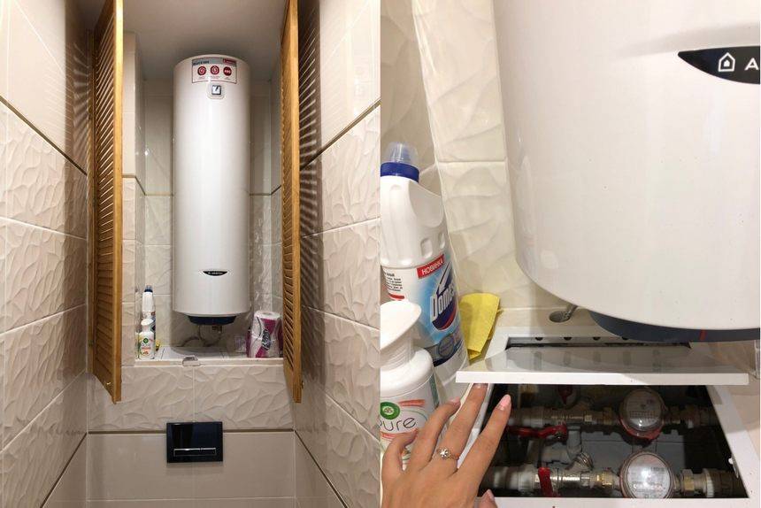 В случае если ниша должна выполнять утилитарную миссию, то есть внутри нее подразумевается наличие полок с чистящими средствами или бойлер, который хочется спрятать (а может быть трубы как раз и занимают всю нишу), разумно предусмотреть дверцы для санузла или другие варианты декорирования.