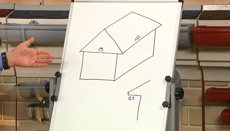 Чтобы рассчитать количество элементов, необходимо схематично нарисовать эскиз бани, выполнить замеры постройки, а затем проставить их на рисунке. Это максимально упростит процесс расчетов. Затем на этой же схеме можно нарисовать проект водосточной системы с указанием элементов.