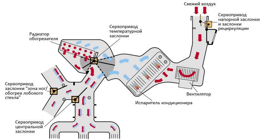 В зависимости от температуры окружающей среды и установленного режима, используется нужный рабочий элемент. Если необходимо понижение температуры, то ЭБУ включает кондиционер и поток проходит через испаритель, в результате чего воздух охлаждается. Далее воздушная масса по воздуховодам подается в установленные зоны (перенаправление потока осуществляется открытием/закрытием заслонок). Если выходной датчик улавливает понижение температуры ниже установленной нормы, ЭБУ подает сигнал на центральную заслонку, и часть воздуха, вышедшего после испарителя, направляет на радиатор обогревателя. После печки этот воздух смешивается с основным потоком, повышая его температуру до нужного уровня.