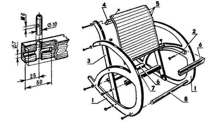 В заключение полученные точки соединяют с помощью лекала плавной кривой. Не смущайтесь, если касательные к ней окажутся не перпендикулярными радиусам: чтобы кресло было устойчивым, оно в каждый момент покачивания должно оказываться как бы на обратном уклоне. Масштаб при построении желательно брать не мельче 1:5.