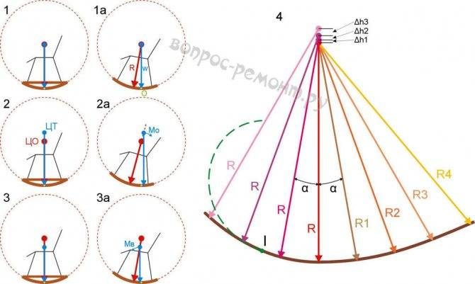 Если ЦТ выше ЦО, то его проекция при любом наклоне «убегает» наружу, назад или вперед, от точки касания. При малейшем наклоне возникает опрокидывающий момент Мо (поз. 2 и 2а), качалка оказывается неустойчивой.