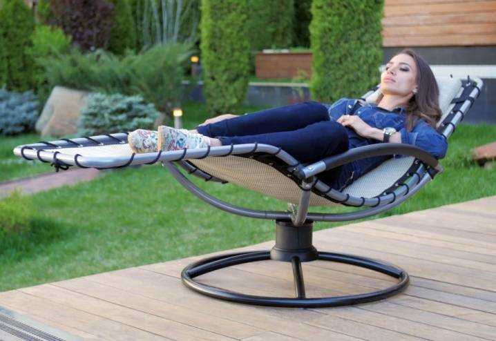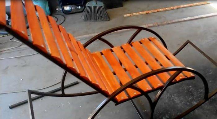 При наличии простейшего ручного трубогиба и опыта работы с такими инструментами, как угловая шлифовальная машинка и сварочный аппарат, сделать каркас кресла качалки из стальных труб круглого или прямоугольного сечения не составит особого труда. Подобные изделия смотрятся оригинально. Снизить массу поможет изготовление спинки и сидения из прочной ткани или капронового или джутового шнура.