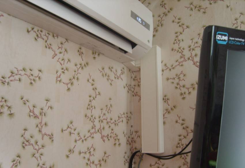 Установить внутренний блок можно слева или справа от наружной стены.На заметку! Самый бюджетный способ прокладки трассы в помещении – установка коммуникаций в углу комнаты. В качестве маскировки используются специальные короба.