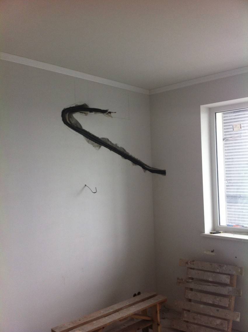 Если работы будут производиться на лицевой стороне здания или же дом представляет культурную или историческую ценность, нельзя будет протянуть по наружной стене трубы и кабели, не испортив при этом внешний вид фасада. В этом случае трасса кондиционера монтируется в помещении. Коммуникации укладываются в штробы. Этот способ монтажа требует значительных затрат и усилий, зато результат получается эстетичным.