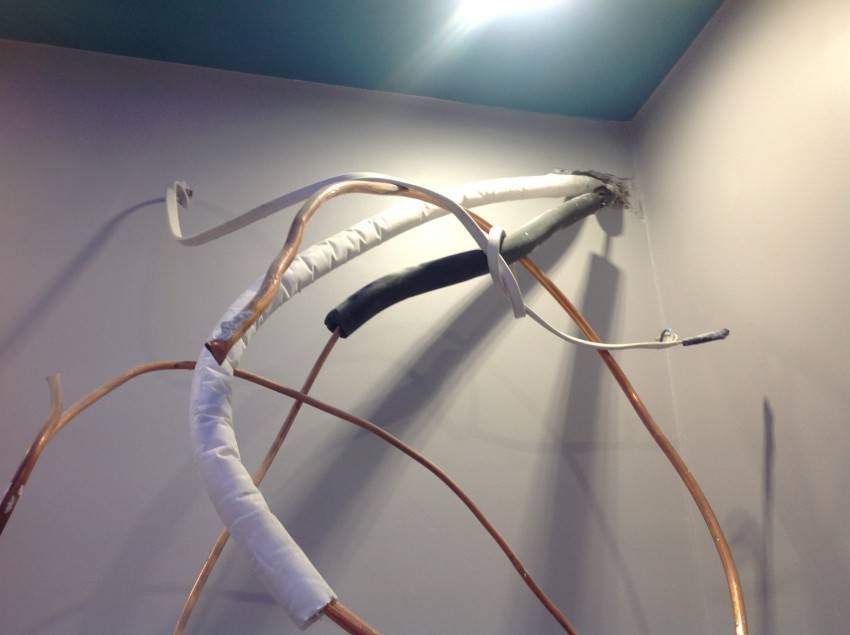 - Трубки применяются с разными диаметрами, один больше другого, а их длина равна длине кондиционера + 40см. Отрезаем нужный кусок, заглушим края и проводим через стену