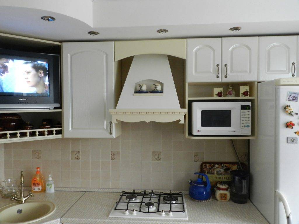 - Категорически запрещается установка над раковиной, на высоком холодильнике, газовой плитой. Желательно чтобы телевизор, если такой есть на кухне, был помещен высоко под потолком на специальных кронштейнах.