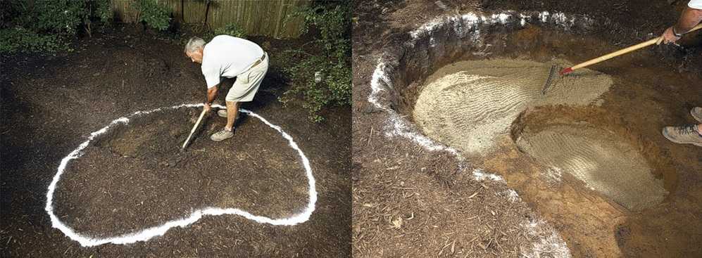 Выбранный резервуар можно или закопать вровень с уровнем грунта, или оставить бортик. Чаще всего борта декорируют камнем или галькой. В зависимости от этого выбирают глубину котлована. Его выкапывают по размерам чуть больше, чем чаша.