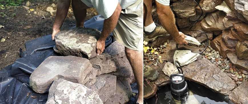 Уложенную в котлован пленку декорируют валунами. После ставят насос