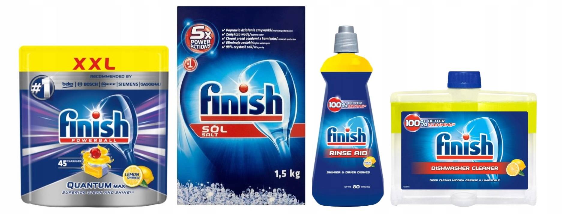 Компания Finish специализируется не только на выпуске таблеток для посудомоечных машин, в каталоге представлены сопутствующие продукты, улучшающие очистку и работу оборудования. В данную категорию относятся смягчители воды, усилители блеска, ополаскиватели, освежители. Они используются совместно с моющими капсулами, целесообразность их применения зависит от разных факторов. В линейку средств для мытья посуды входят следующие препараты: Finish All in 1 Max Finish All in 1, Powerball Classic, Finish Quantum.
