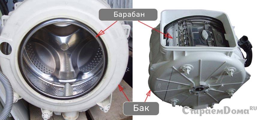 Сразу поясню, чтобы разобраться, где в стиральной машине находится бак и не перепутать его с барабаном смотрите изображение ниже.