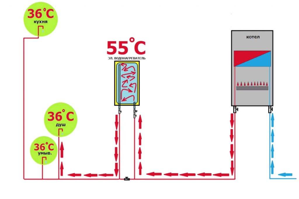 Водонагреватель, врезанный в контур горячего водоснабжения, выступает в роли буферной ёмкости. Его предназначение – выравнивание температуры горячей воды и сглаживание возможных скачков температуры. Водонагреватель накопителя и нагреватель газового котла выставляют на одну и ту же рабочую температуру.