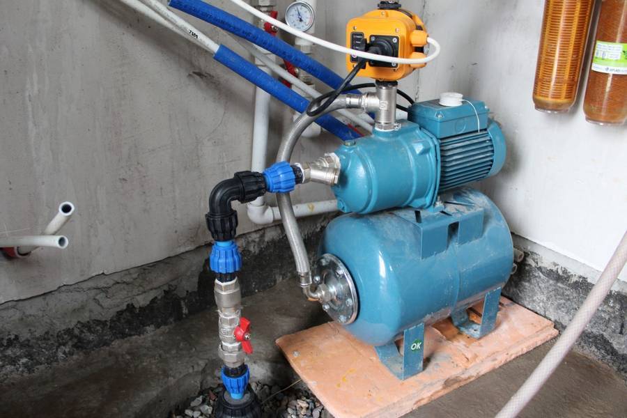 Важно выпустить из системы весь воздух! Далее подключают напорную часть с разводкой по дому. На этом этапе закрывают заливное отверстие и проверяют давление в гидроаккумуляторе (баке). Если давление не соответствует указанному в инструкции, его следует повысить (докачать насосом) или понизить (спустить)