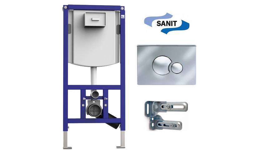 SANIT Ineo Plus. Система предназначена для крепления на пол и к стене. Слив воды управляется двумя кнопками: максимальный и эконом. В комплект входят бачок, рама, кнопка смыва и набор креплений.