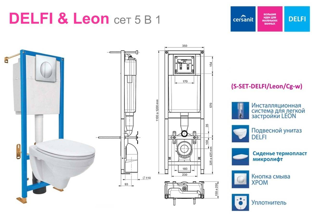 Cersanit Delfi Leon. Готовый набор для установки подвесного унитаза, в который входит: рама, анкерные болты и шпильки для крепления, бачок, кнопка слива, унитаз и сиденье. Вам ничего не потребуется докупать дополнительно. Система рассчитана для установки на пол и крепления к стене. Уникальность модели – малая ширина всего 35 см, поэтому ее можно установить в достаточно узком пространстве.