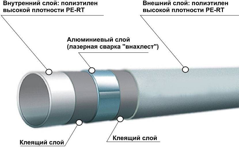 Металлопластиковые конструкции производятся из нескольких слоев, внешние и внутренние представляют собой сшитый полиэтилен PEXb, а по середине располагается прослойка алюминиевой фольги. Материалы склеены между собой.