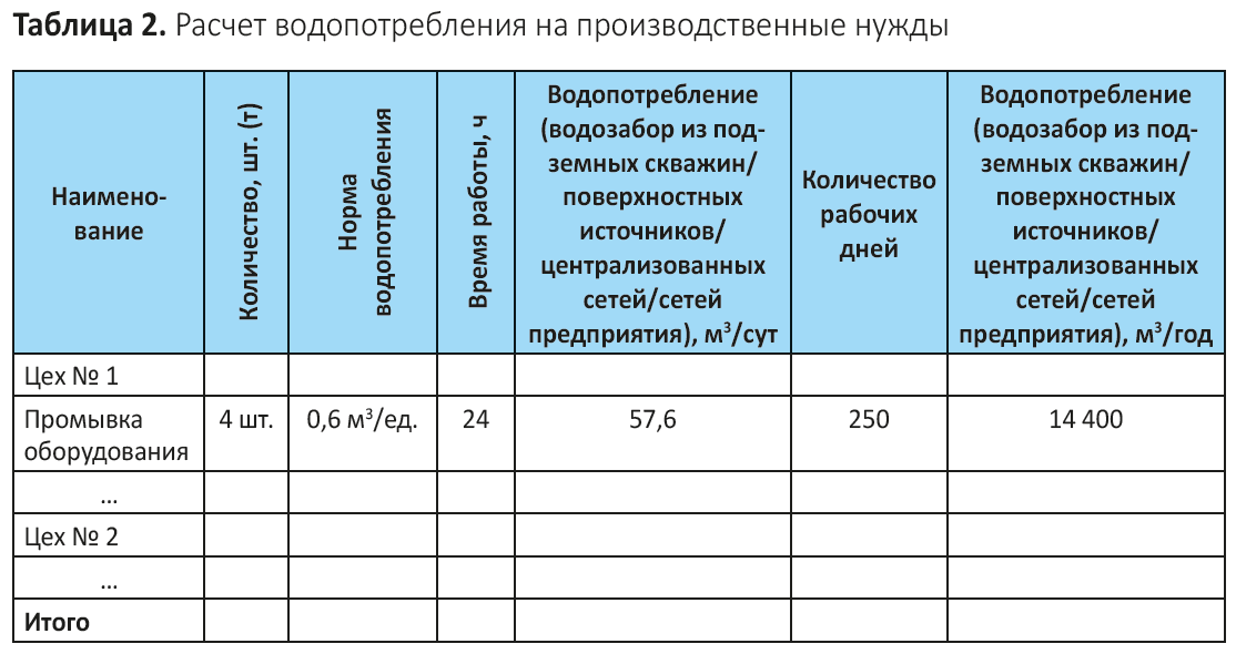 Нормы водоотведения обычно представлены в тех же документах, причем может быть указан только процент объема, который поступает на выпуск сточных вод/в потери/остается в продукции. К потерям можно отнести испарение, унос ветром. В случае если вода остается в продукции (например, производство бетона), можно добавить безвозвратное водопотребление. Для удобства расчет можно показать в виде табл. 2.