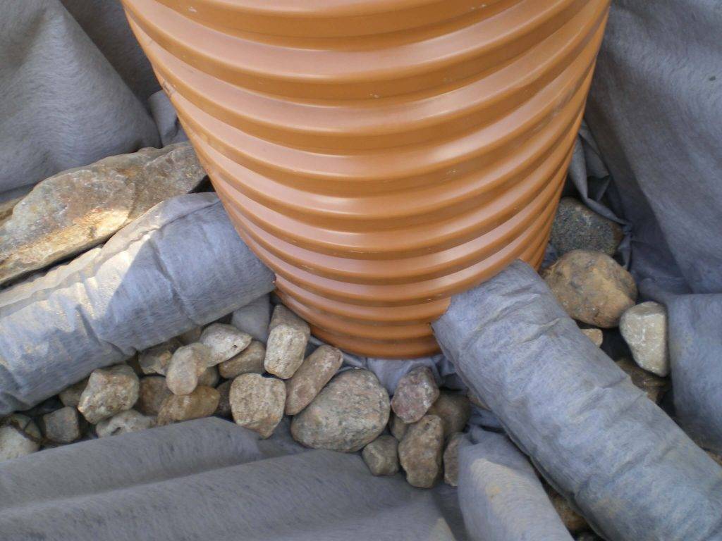 - трубы засыпаются гравием, а сверху их накрывает дренажная геоткань внахлест, на концах веток полотна надежно фиксируются полимерной веревкой;