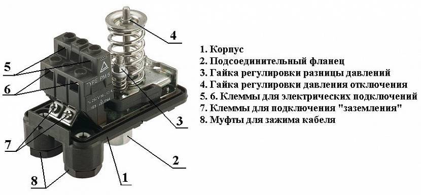 Этот прибор состоит из двух частей — электрической и гидравлической. Электрическая часть — это группа контактов, которая замыкается и размыкается включая/выключая насос. Гидравлическая часть — мембрана, которая оказывает давление на металлическое основание и пружины (большая и малая) с помощью которых давление включения/выключения насоса можно изменять.