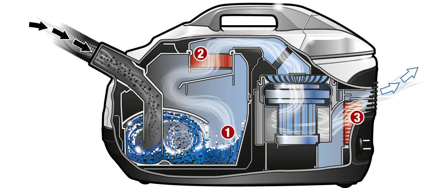 Ремонт моющих пылесосов не отличается от описанного выше. Однако агрегаты вмещают помпу, подающую воду в шланг. Вернемся к вопросу в обзорах позже. Что касается входного тракта, не отличается конфигурация от обычного, исключая наличие водяного фильтра. Большинство выглядят унылыми коробками, залитыми водой. В некоторых пылесосах с аквафильтром на стыке шланга и корпуса бьют тонкие струйки воды. Работает первичное улавливание пыли. Однако заметить неисправность сложно. Другое дело, если пылесос оснащен опцией самодиагностики, которая подскажет место дислокации поломки.